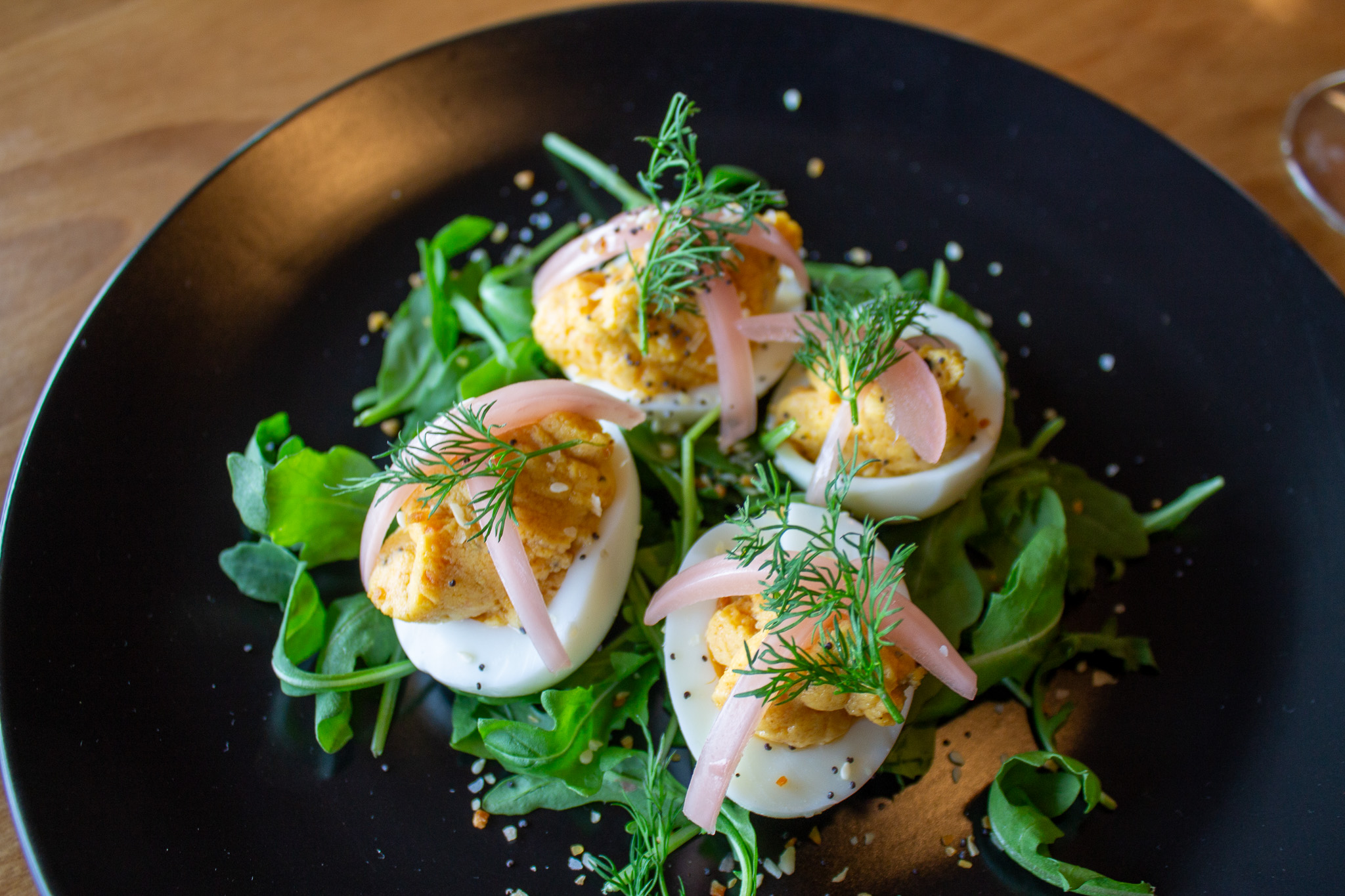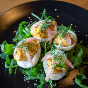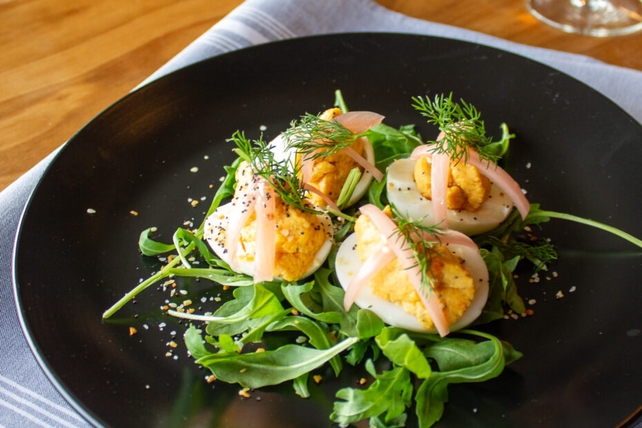 Deviled eggs elevated with smoked salmon, everything bagel spice, pickled red onion, and fresh dill. The best of brunch re-imagined into an elegant, two-bite appetizer.