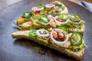 Butter-poached Maine lobster and seasoned avocado spread on toasty artisan bread, finished with thinly sliced shallots, lemon, and black sea salt.