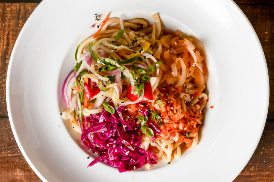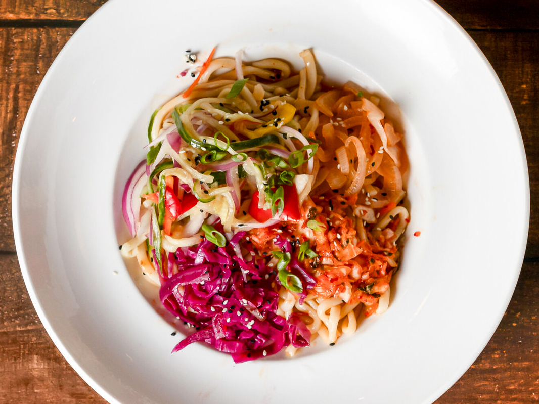 Udon noodles, scallions, and sesame seeds tossed in a Korean chili-garlic sauce.